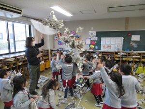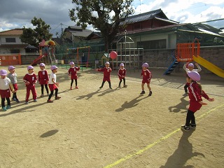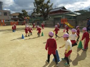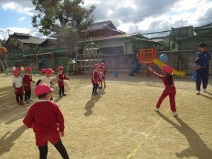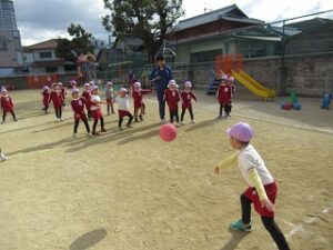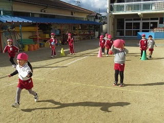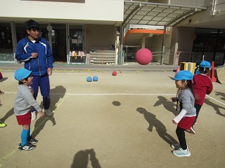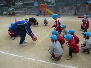 今日は朝からとても寒くて、移動時には「寒い~!!」とほっぺを真っ赤にしていた子どもたちですが、元気いっぱい体育指導に参加しました。
