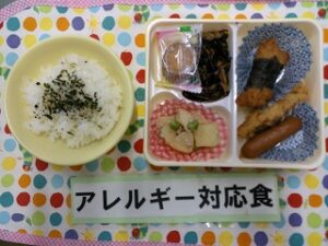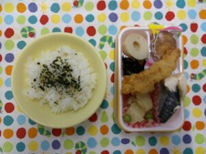 ご飯(海苔香味)、サバの塩焼き、じゃが芋のそぼろ煮、スティックチキン、ひじきの炒め煮、ちくわ煮、ミレービスケット