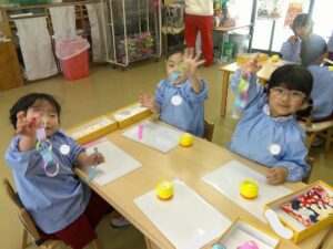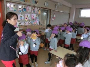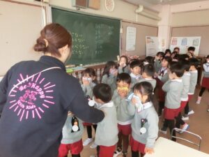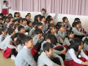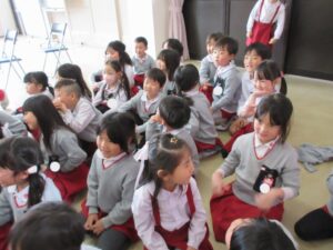 今まで、お辞儀のしかた、箸の使い方、茶の湯で抹茶を頂いたり、年長組になって初めてのことをたくさん教えて頂きました。