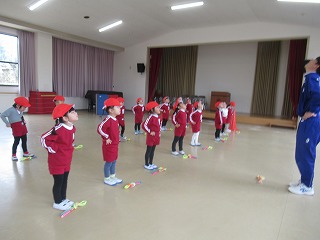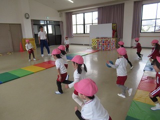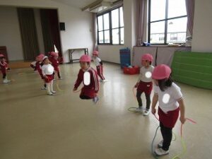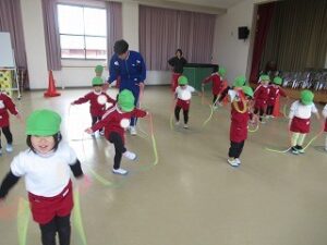 今日の体育指導は縄跳びとボールを使って体を動かしました!