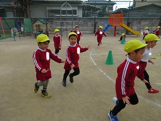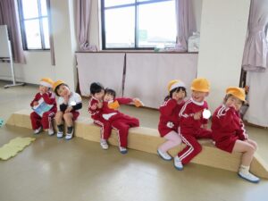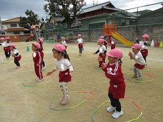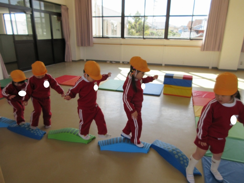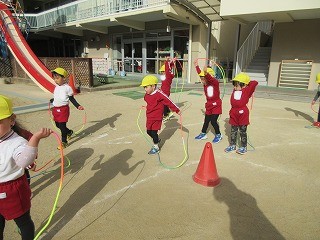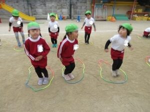 「回して飛行機!」の声掛けに合わせて飛んだ後、飛行機のポーズをすると連続飛びが上手に出来るよと教えてもらいました。