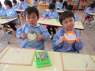 新しく入園予定の年少さんに、「いっぱいいっしょにあそぼうね」の気持ちを込めて、メダルを作りました!