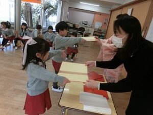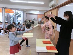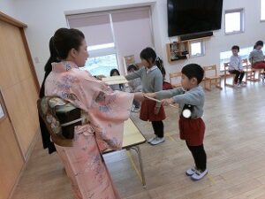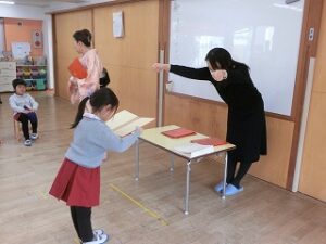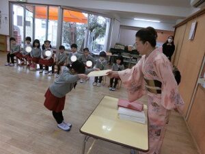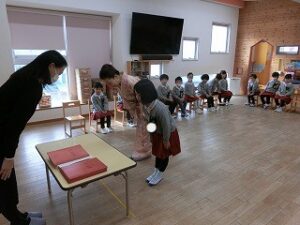 まだまだ、練習中ですが、頭からではなく、胸からのお辞儀がとっても上手な年長組の子どもたちです☺