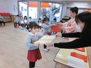 名前を呼ばれて「はいっ」と元気よく返事をしてから、園長先生がいる、演台のところまで歩いていきます。