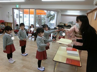 名前を呼ばれて「はいっ」と元気よく返事をしてから、園長先生がいる、演台のところまで歩いていきます。