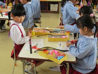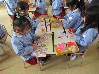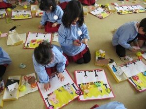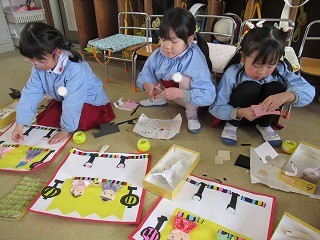 細長い黒の画用紙に、小さく切ったカラフルな折り紙を貼ってお雛様達が座る台を作りました!