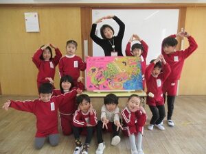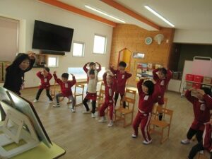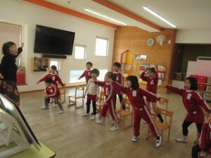 園長先生から、「緑組のお部屋に戻ったら、みんなに教えてあげてね」とお話があったので、早速イカタロウダンスをお友だちに教えてあげている子がいましたよ!