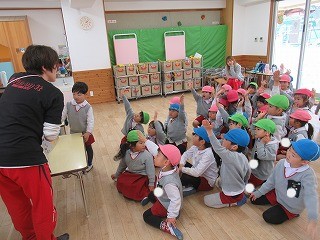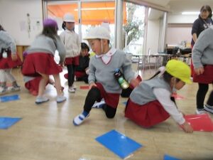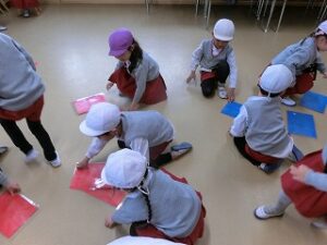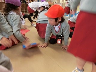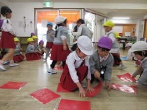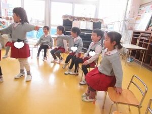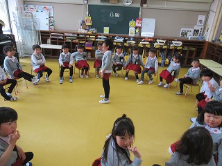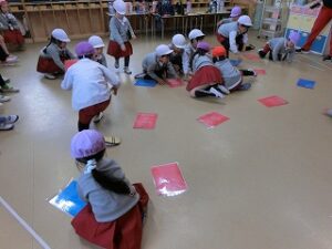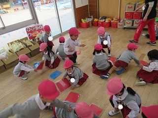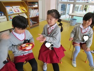 音楽に合わせてお寿司を落とさないように隣のお友だちに渡します。