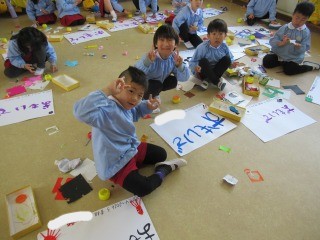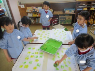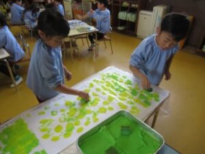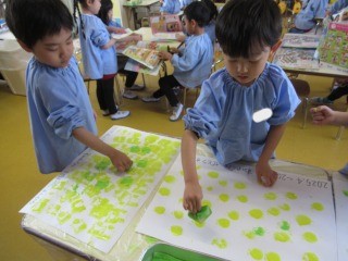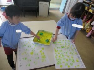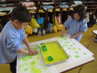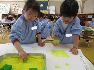 絵の具とスポンジを使って、スタンピングをしたよ♪