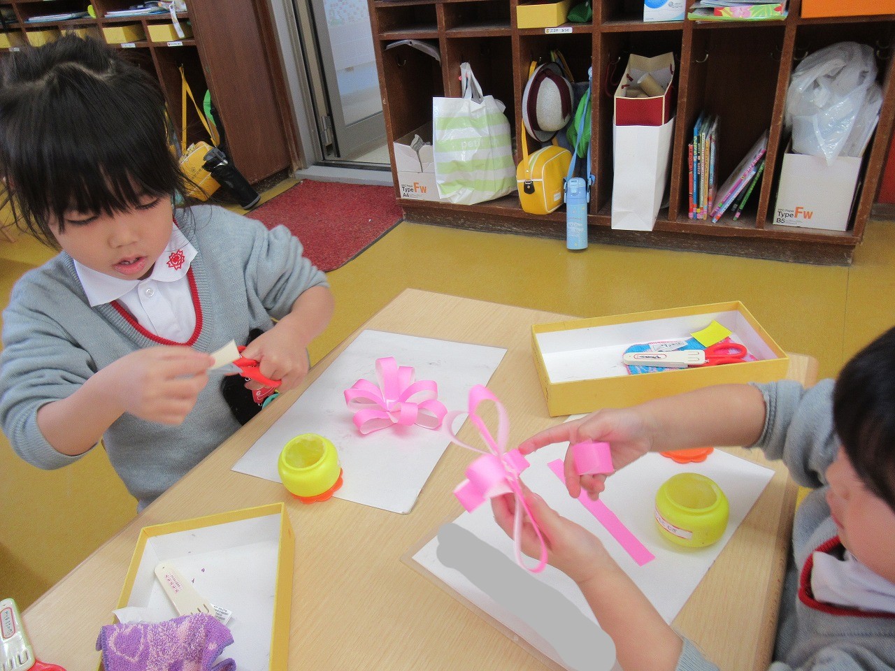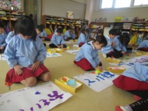 卒園式に飾るお花を「おめでとう」の気持ちを込めて、一生懸命作っています。