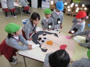 製作では、はらぺこあおむしに変身できるお面とちょうちょのおもちゃを作りました。