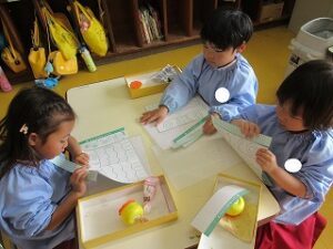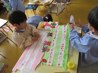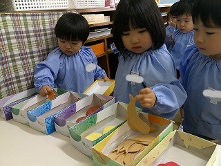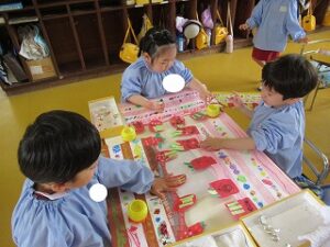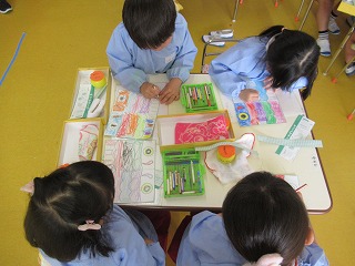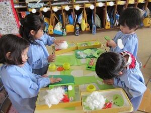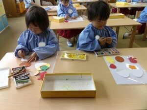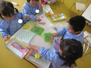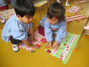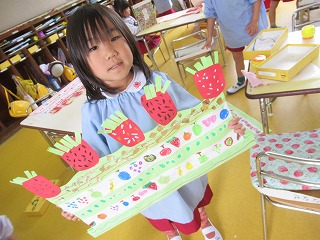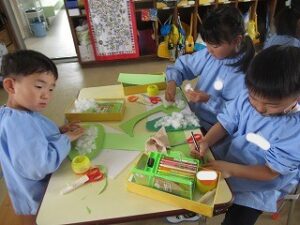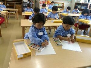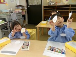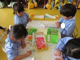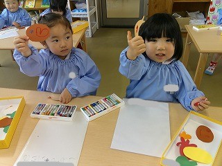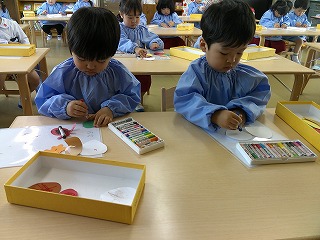 今日の製作はお弁当作り。いちご組はおにぎりの具をクレパスで描きました。どんな具を入れようかな。
