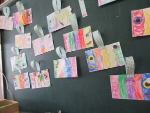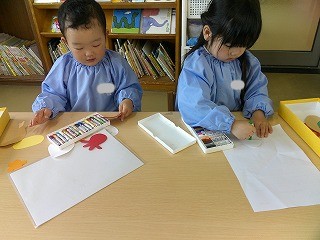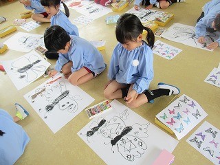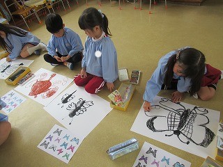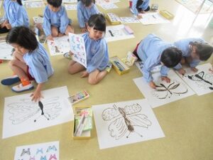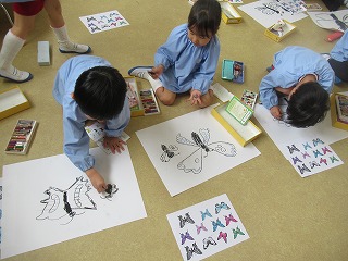 大きく1匹を描いたり、小さなちょうちょも描いたりと、思い思いに書くことができました。