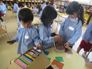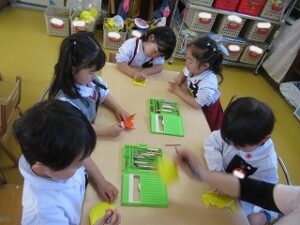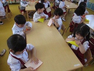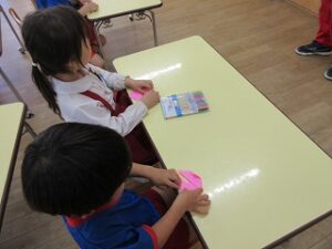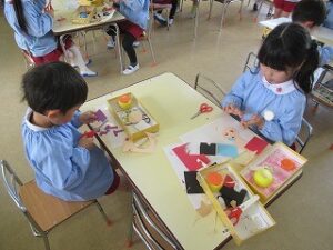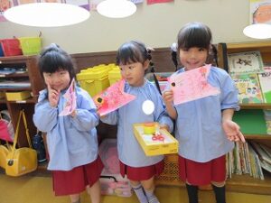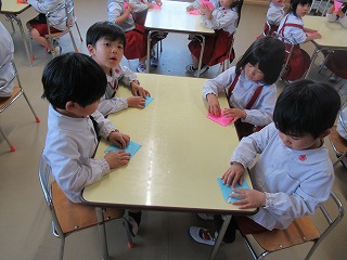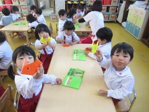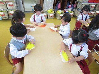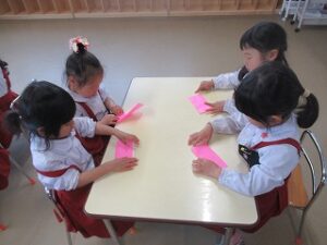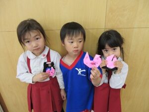 指先を使う折り紙遊び、1年間を通して少しずつ難易度の高いものにも挑戦したり、季節にちなんだ折り紙を楽しんだりしていきたいと思います。