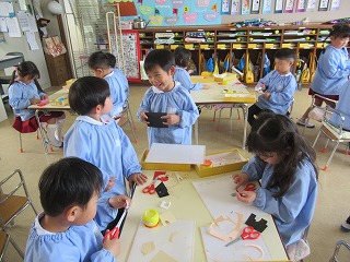 先生の見本を見ながら、一生懸命折っていました。顔や模様も描いて、素敵な仕上がりになりました♡