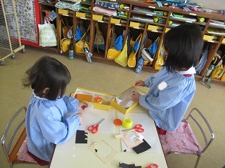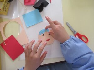 「何色の服にしようかな~」「どんな髪型にする?」など、お友だちと相談しながら画用紙を切り貼りしながら作っていくよ✂