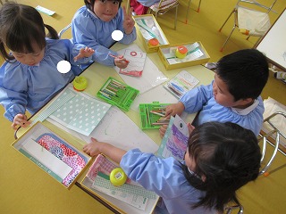 どんな模様にしようかな??ポンキーペンシルを使って色んな色で作りました!