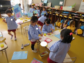お誕生日表に掲示する、自分人形を作成中の青組さん!