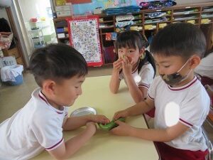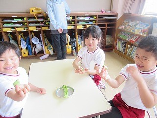 今日はそのお話を読んだり、実際にそらまめを触って壁面製作を題材に作りました。