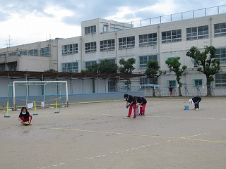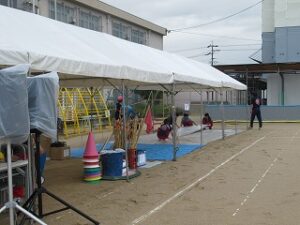 中止にした4日の雨で、運動場のラインはすっかり消えてしまっていました。9時開催をめざし、7時過ぎから全員で開催に向けた準備を行いました。