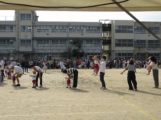 初めての運動会を体験したりす組の子どもたち。お家の人に抱き上げられている姿に、見ているものはみんな笑顔になりました。