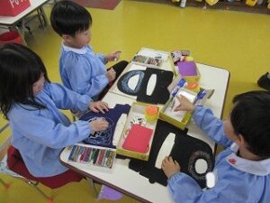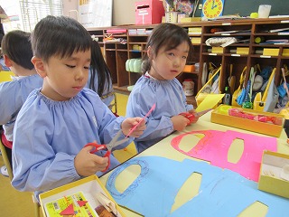 今日は、口の周りにモジャモジャのお髭をパスで描いたり、鬼の口に強そうな牙を画用紙で切り貼りして作りました。