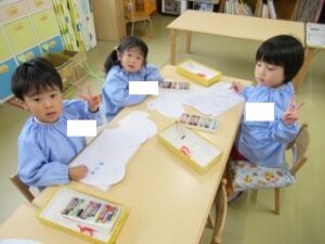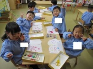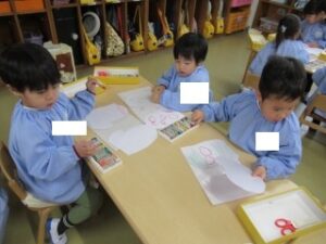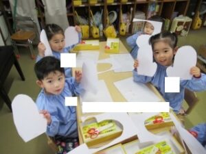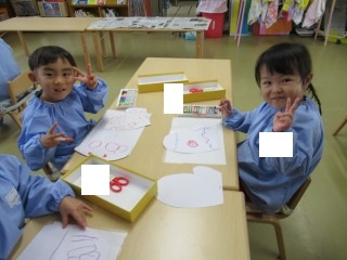 いろんな動物が登場し、とっても可愛い絵本です。このお話に登場するてぶくろを作ろう!ということで自分のすきな柄のてぶくろを製作しています。