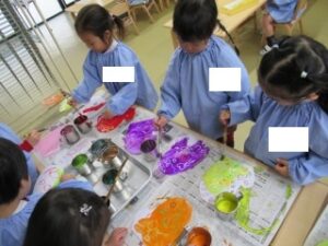 クレパスで描いたに上から絵の具を塗り、バチック(はじき絵)をしました。
