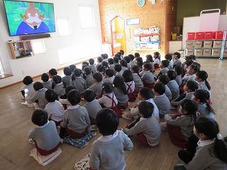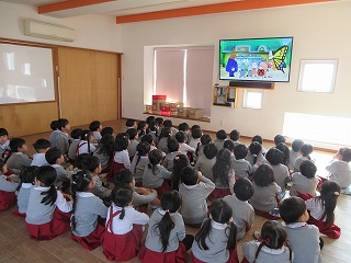 今日は、消防署からお借りした地震についてのお話「地震がきたらどうする?むしむし村の防災訓練」というDVDを観ました!