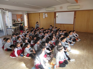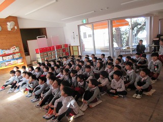 毎月1回、火災や地震・不審者対応等の避難訓練をしている子どもたち。「おさない・はしらない・しゃべらない・もどらない」『おはしも』のお約束もしっかり覚えていて、先生たちに教えてくれました。