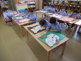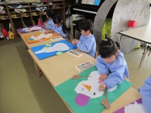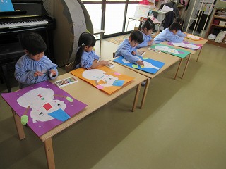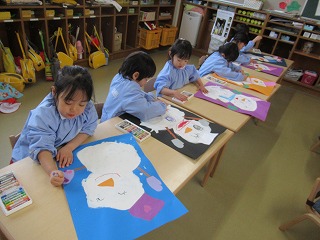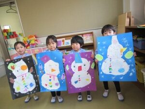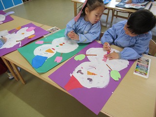 雪だるまの絵画に目や口、手袋やボタンを描きました☆