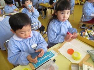 好きな色の画用紙を選んで、三角の立体を作って糊で貼りあわせました。