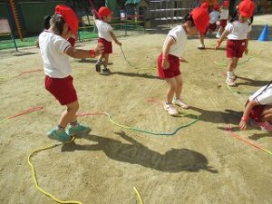 今日の体育指導は初めての「縄跳び」でした!みんな縄を手にすると、ご機嫌で先生の話を聞いて、縄遊びに参加しました。