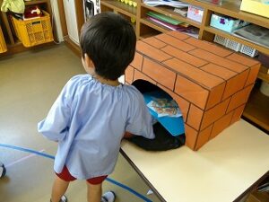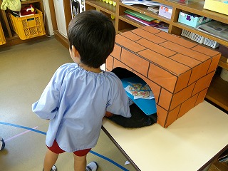 パズルで遊んでピザの形に戻ったら、釜で焼いていきましょう~!