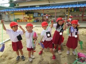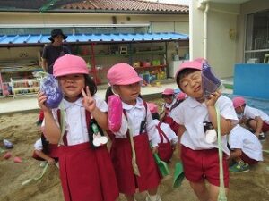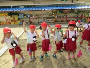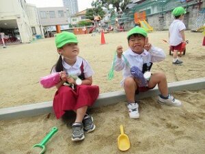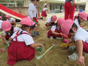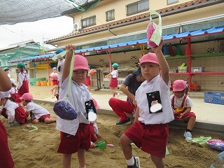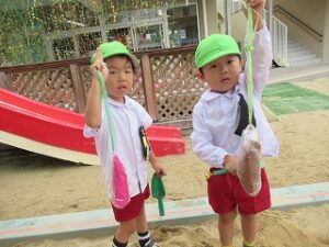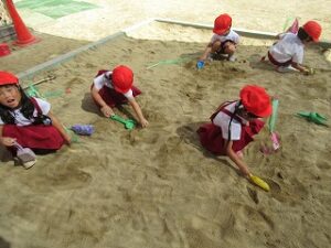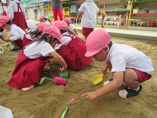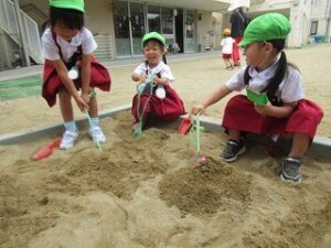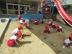 今日は、自分達で作った手作りさつまいもを砂場に埋めて、練習してみよう✨