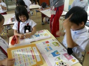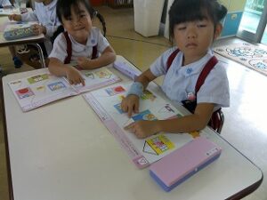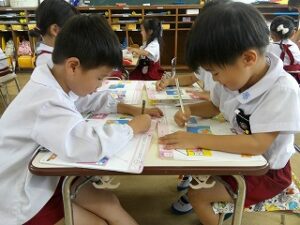 先生に教えてもらって、反対の手はノートを押さえることにしました!