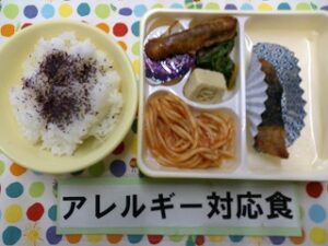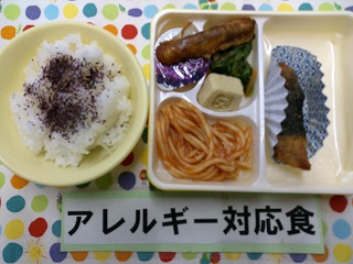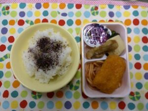 ご飯(ゆかり)、えびかつ、スパゲティナポリタン、ごぼうの天ぷら、ほうれん草のおかか和え、こうや豆腐の煮物、ミニゼリー(ぶどう)