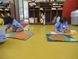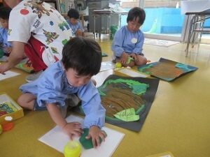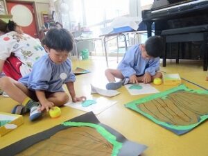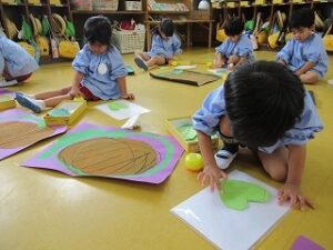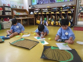 今日は、画用紙で作った葉っぱを糊で貼り付けていくよ!