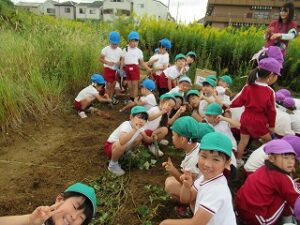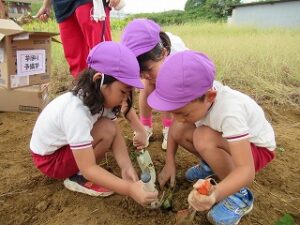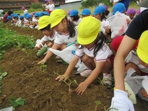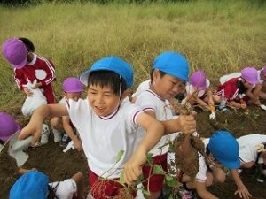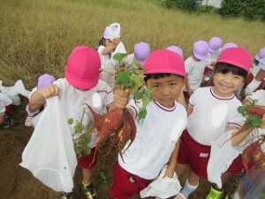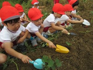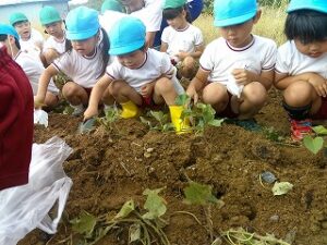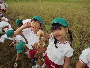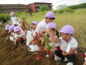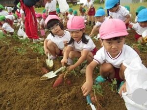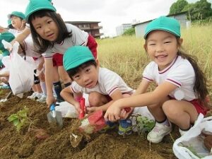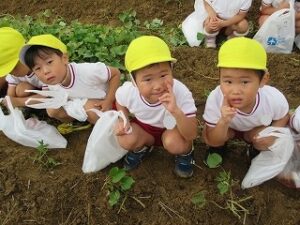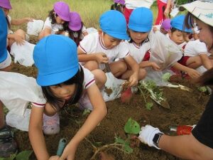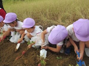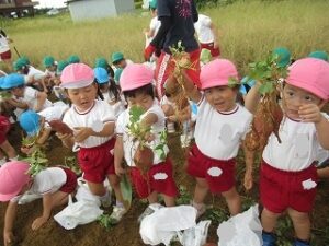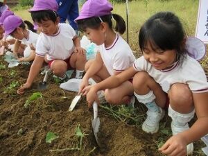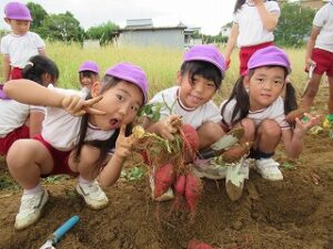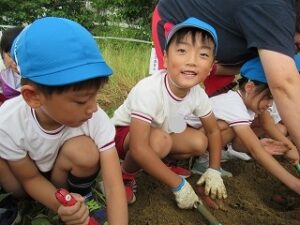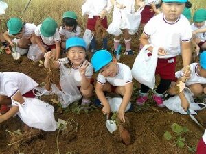 登園すると「スコップ持ってきたよ!!」「お芋ほり~!!」と期待いっぱいの子どもたち。