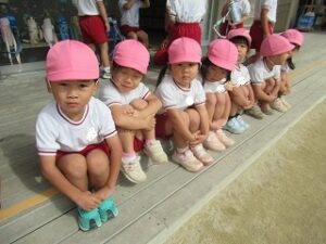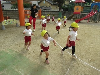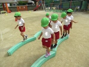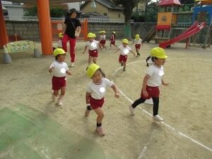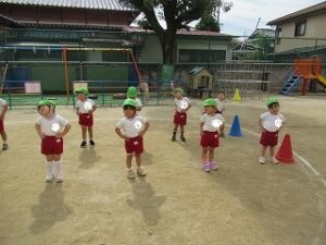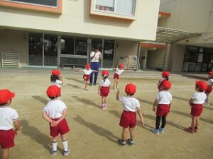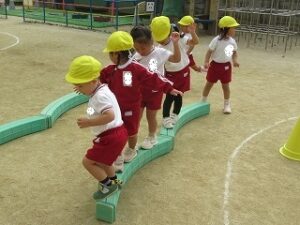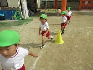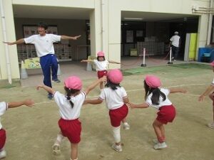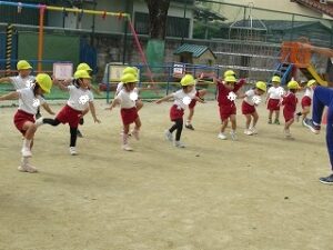 準備体操が終わったら、スキップをしたり、ケンケンパーをしたりします。
