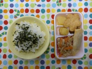 ご飯(海苔香味)、豚肉のしょうが焼き、春巻き、三色ナムル、ミニハッシュドポテト、花形さつま、りんご缶