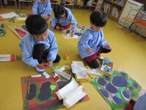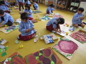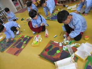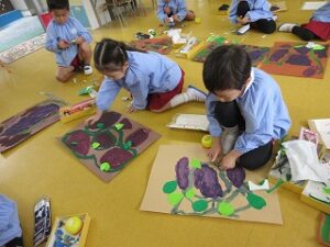 昨日、絵の具で描いた大きなお芋に葉っぱをつけたよ!
