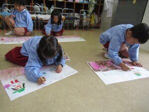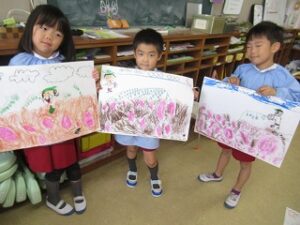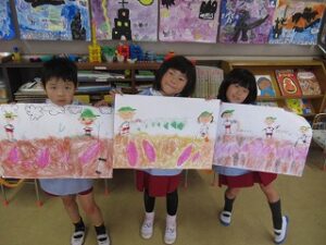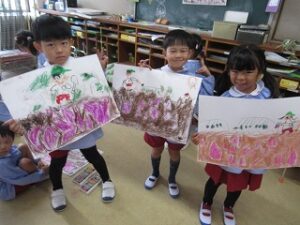 昨日描いたさつまいも畑の絵に、芋ほりをしている自分たちの姿を描いていきました!