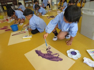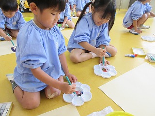 「もう少し青色をいれよう!」と、お友だちと色を見せ合いっこ(^o^)