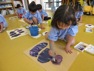 みんなが掘ったお芋みたいな、大きなお芋を絵の具を使って描いたよ♪