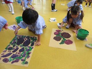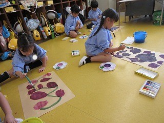 蔓の色も緑色に少し黄色を混ぜて黄緑色にしてみたりと、自分たちでいろんな色を混ぜ合わせて色の調整♪