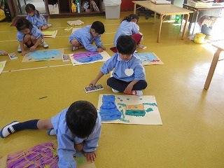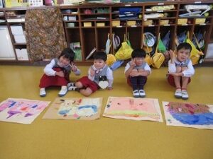 クレパスでしっかり色を塗って、おいしそうなお菓子が出来上がりました。