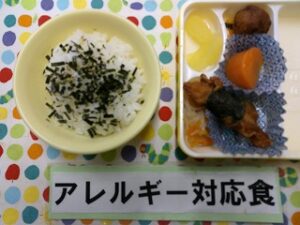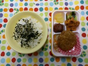 ご飯(海苔香味)、メンチカツ、チンゲン菜のソテー、チャプチェ(副菜)、ミートボール(トマト)、星型しんじょ、りんご缶