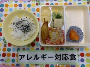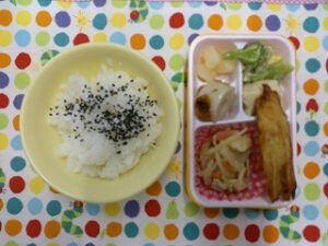 ご飯(ゴマ塩)、八宝菜、ポテチキ、ブロッコリーサラダ、こうや豆腐の煮物、ちくわ煮、洋梨缶🍐