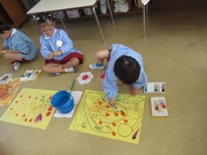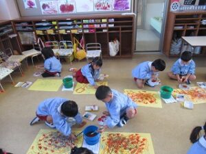 昨日、パスで画用紙に描いた動物たちを絵の具を使って、森の中の葉っぱを表現するよ🍁